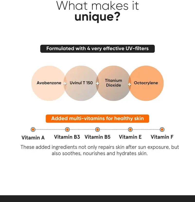 A light weight, moisturiser-meets-sunscreen. This broad spectrum SPF 50 with PA++++ rating, has a very light texture that spreads easily & disappears leaving behind a natural, moisturised, non-shiny look. Loaded with Vitamins A, B, E & F that help repair skin and minimize damage caused by UV exposure.